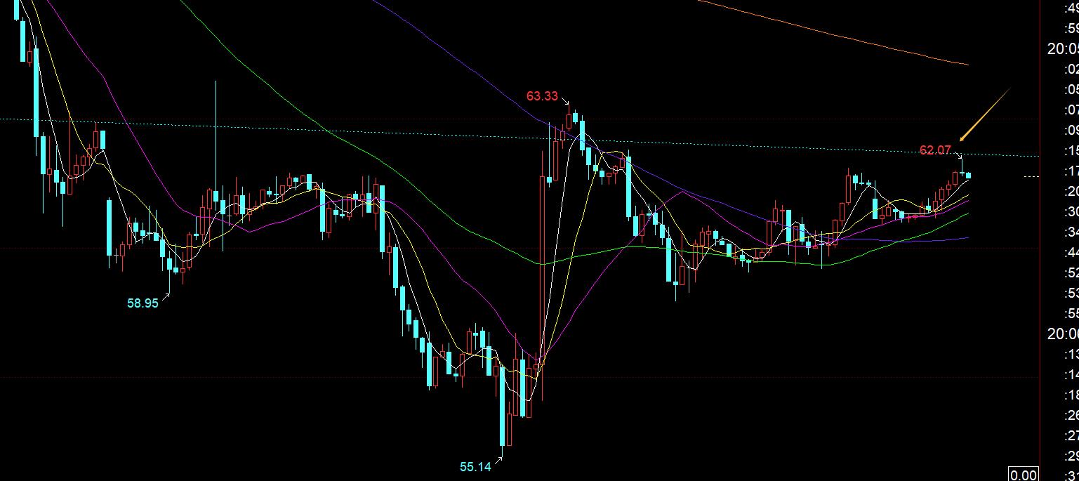 原油方面:这几日基本观望,幅度不大,走势墨迹,今日还是关注图中反压点62.2一线得失,若突破站上了,则可以测试63.8关键阻力;若站不上,又可能会打压至右肩58.8;